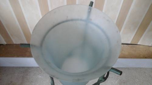 THE ICE BUCKET IS ALSO ROUND AND LONG AND LOOKS TO BE FROSTED.