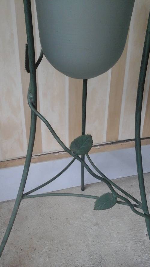 THE STAND OF THIS GORGEOUS PIECE IS MADE FROM ROUND BAR/ THICK WIRE. IT IS ROUND IN SHAPE/ GREEN IN COLOR AND STANDS ON THREE LEGS WITH RUBBER FEET. IT HAS A GORGEOUS LEAF DESIGN WRAPPED AROUND IT.