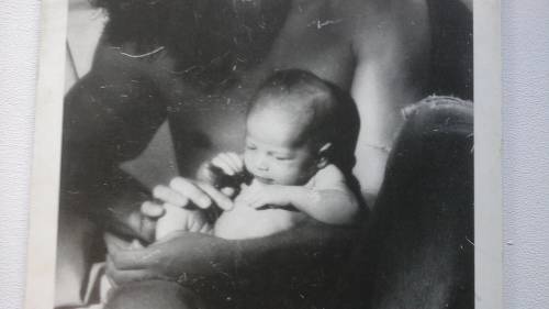 THE STUNNING BLACK AND WHITE PHOTO DEPICTS A MALE MODEL (ADAM PERRY) HOLDING A YOUNG BABY.