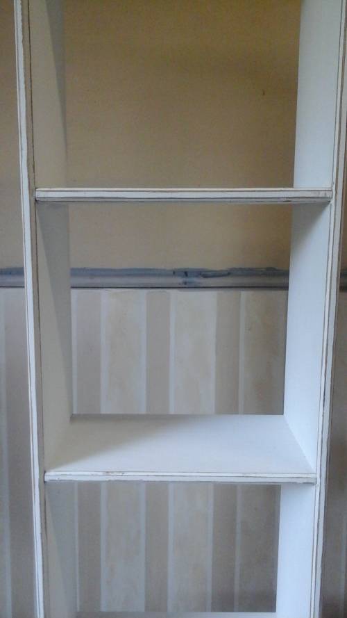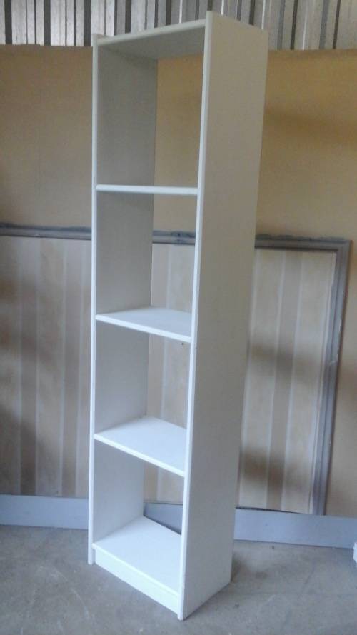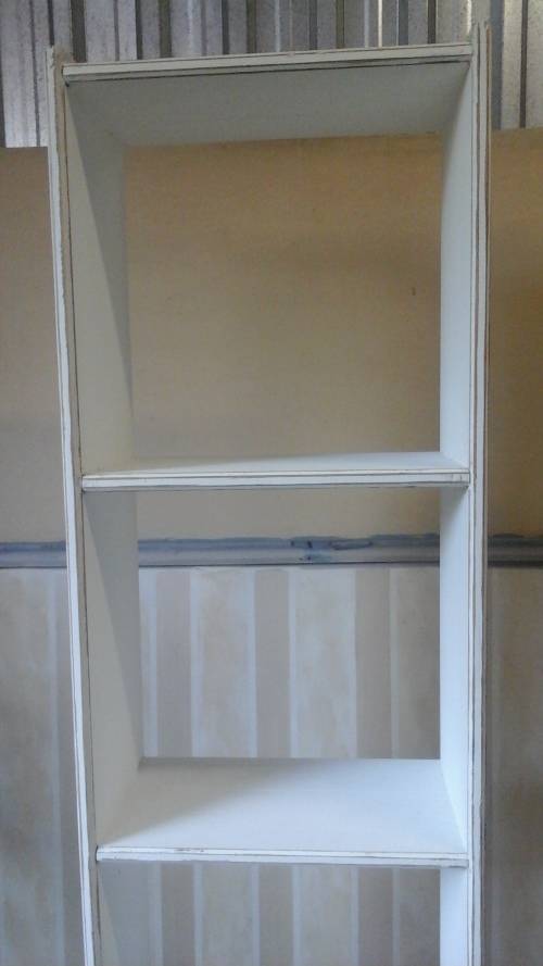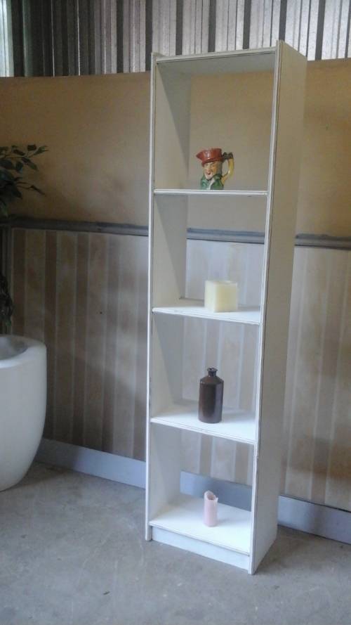 THIS STUNNING PIECE IS RECTANGULAR IN SHAPE AND WHITE IN COLOR. IT HAS FOUR SHELVES AND HAS NO BACKING.