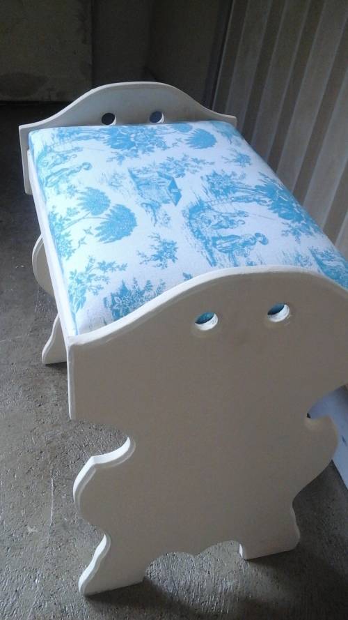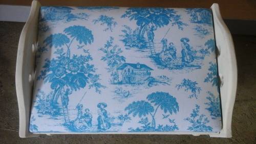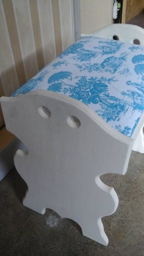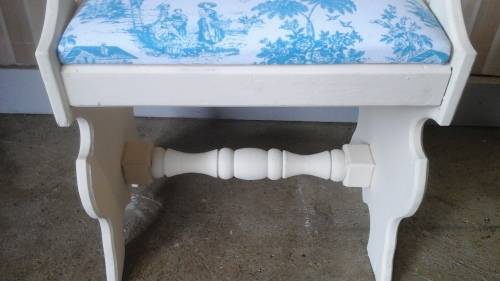 THE SEAT HAS A GORGEOUS BLUE AND WHITE FABRIC CUSHIONING. THE FABRIC HAS GORGEOUS ILLUSTRATIONS.