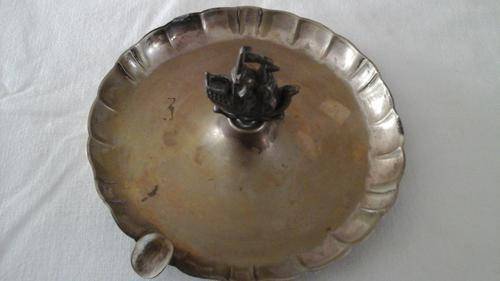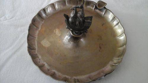 SIMPLY STUNNING EPNS ASHTRAY WITH A MODEL SHIP IN THE CENTRE. SHIP CAN ACT AS A HANDLE. APPROXIMATELY 200 MM