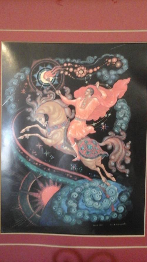 IT IS A BEAUTIFUL PIECE THAT SHOWS A MAN ON A HORSE OUT IN SPACE JUMPING OVER THE PLANTER AND THE SUN, HE APPEARS TO BE DOING SOME SORT OF PERFORMANCE .