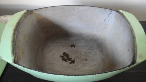 THIS FANTASTIC PIECE IS RECTANGULAR IN SHAPE AND GREEN IN COLOR. IT IS QUIET DEEP AND HAS TWIN HANDLES AND A LID THE COMES COMPLETELY OFF.