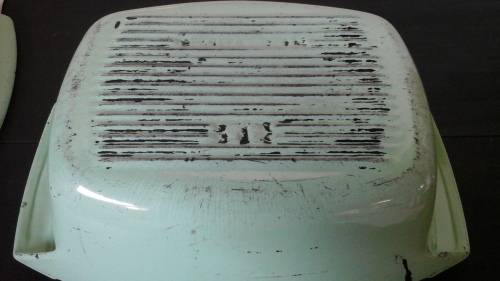 IT IS DISCOLORED AND HAS SCRATCHES FROM USE. OVERALL IT IS IN GOOD CONDITION.