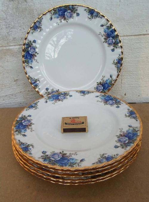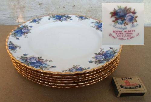 Perfect Set of 6 large 26 cm diameter Royal Albert Dinner plates, decorated in the hard to find Moonlight Rose Pattern, Vivid blue Roses amidst rich gilt trim. Plates are in excellent damage free condition, used a couple of times in almost 30 years. No cracks, no repairs, odd light utensil mark to centres. No repairs. Gilt trim not at all worn. These are available from China replacements UK @ R325 each plus shipping.