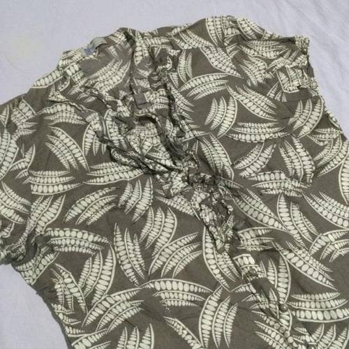 frill detail and shiny beads sewn into the shirt here and there, round khaki buttons down the front and button detail on sleeve - a very beautiful shirt in immaculate condition - as new
