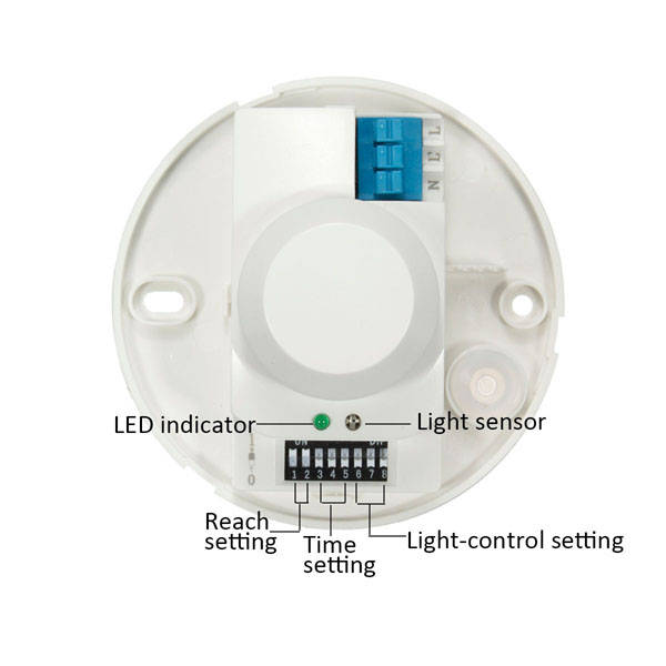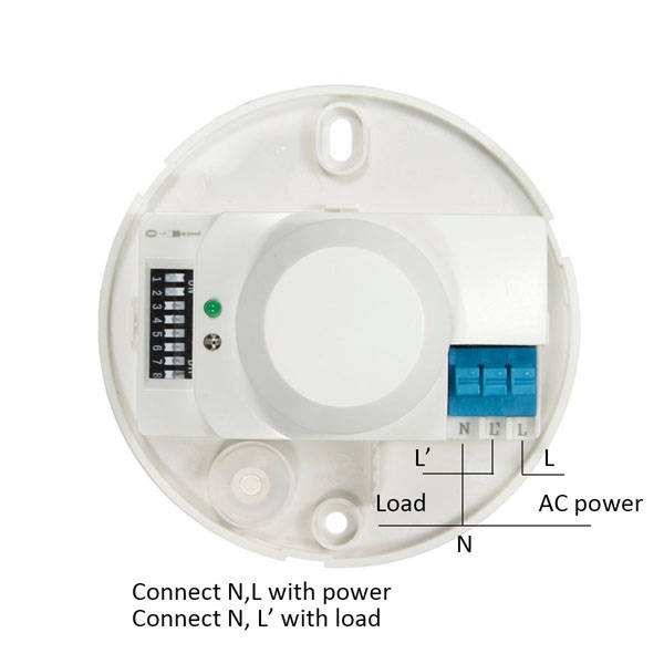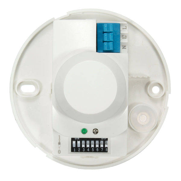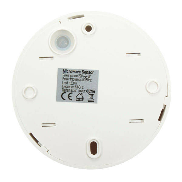 Operating voltage: 220-240V AC Power frequency: 50/60Hz Max load: 1200W HF system: 5.8GHz CW radar Transmission power: <0.2mW Power consumption: <0.5W Installation : Indoors, ceiling mounting Time setting: 10sec to 30min Detection angle: 360° Light control: 10-500LUX Size: 95 x 43mm