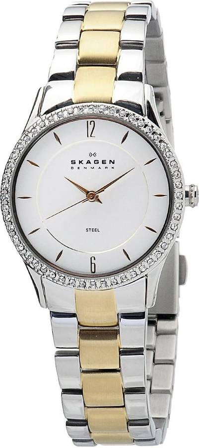 SKAGEN DENMARK ULTRA SLIM CRYSTAL ACCENTED TWO TONE LADIES WATCH