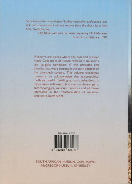 South African museums and the trade in human remains 1907 - 1917. Softcover edition written by Martin Legassick and Ciraj Rassool, published 2002. 100 pages. Registered postage is R40.00.
