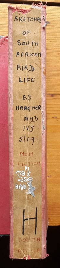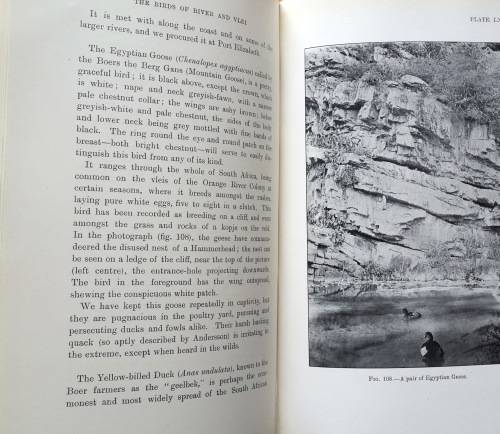 Top edge originally gilt, others trimmed. Frontispiece is photo. of co-authors, one with folding camera, who provided the great majority of the 121 photographs; the other, a rifle. Underneath are facsimile signatures of the authors, both much celebrated early South African ornithologists. Upper corners and spines are bumped, and have marks on. This book remains a solid copy.