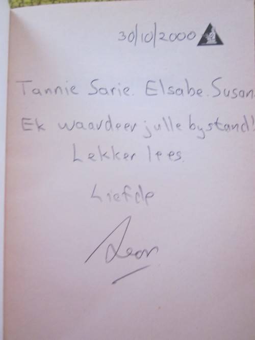 eerste uitgawe 2000 sagteband 211 bladsye, die sagteband het een of twee klein merkies, inskripsie voor in boek en skrywer se handtekening op die volgende bladsy, die bladsye is liggies vergeel en daar is een of twee klein vlekkies in die boek, die teks is skoon en die binding goed- geen oorsese versending