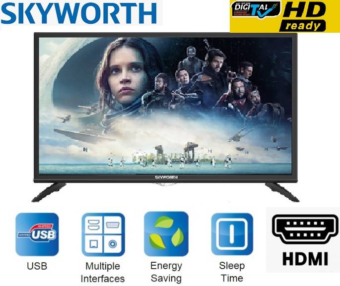 Skyworth 32 inch HD Ready LED Backlit Digital TV - 1366 x 768 Resolution , Brightness 200 cd/m2, Contrast Ratio 1200:1, Response Time 8.5ms , Clear Motion Rate 60Hz DMR, Digital DVB-T2/S2 ,VII Digital Video Processing Engine , 12w Total Audio Output, Retail Box , 2 year Limited Warranty