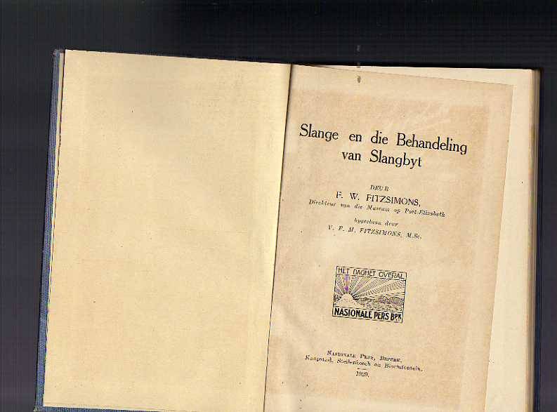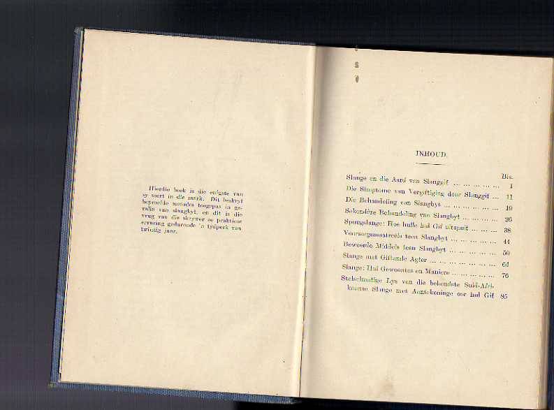 Hierdie boek was die enigste een van sy soort in die mark gedurende1929. Dit beskryf die beproefde metodes toegepas in die gevalle van slangbyt. Dit is die vrug van die skrywer se praktiese ervaring oor 'n tydperk van 20 jaar.