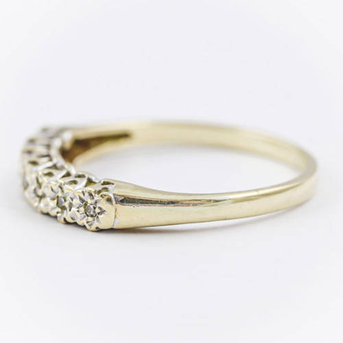 This vintage half eternity ring features 7 x round cut diamonds in an 'illusion'* setting in a piece crafted in 9ct yellow gold. The diamonds are claw set quite deep so they don't stick out above the gold, they lie nice and flat, making the ring easy to wear. The slender shank is narrow until high on the shoulders, then thickening slightly to the height of the diamonds. The ring head measures 15mm across x 3mm wide, and the piece weighs a dainty 1,36 grams. The pedigree of the piece is evident in it's many hallmarks - 375 indicating 9ct gold, the London Assay mark, the jeweller's signature and the date 1990.