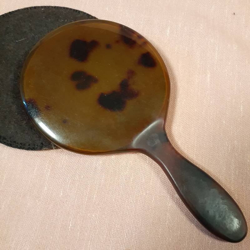 Faux tortoise shell compact mirror with beveled glass and hand stitched protective sleeve. 15cms total length. It could have been made for handbag use