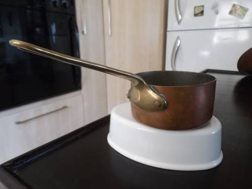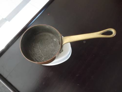 Small Copper Sauce Pot 4cm tall and 8cm Dia. Has Brass Handle, has wear on side. Lovely little thing, great for kitchen decor. Post Net R120, Post Office with tracking number R50.
