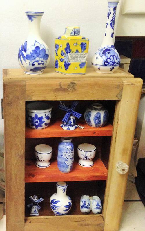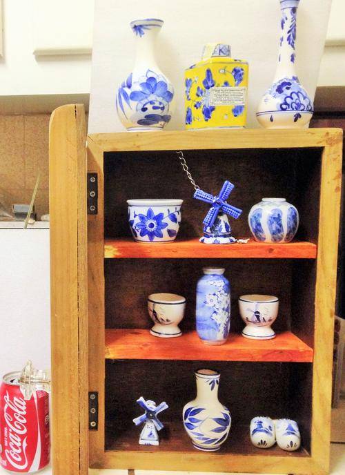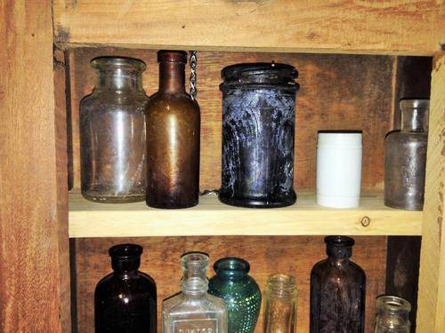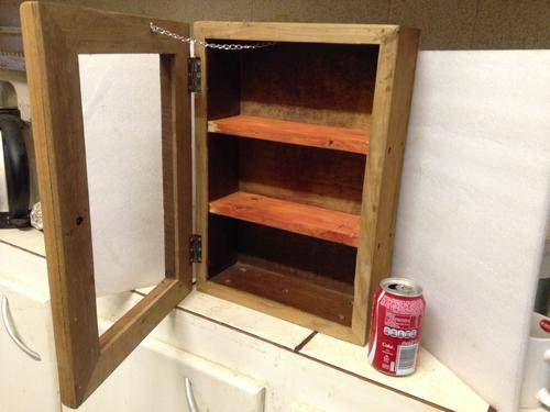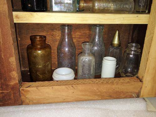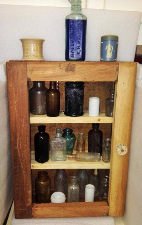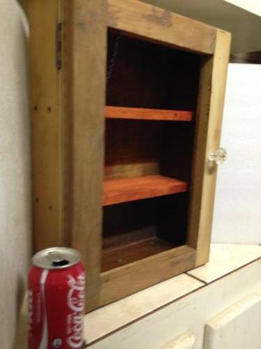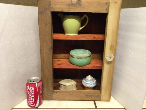 SOLD AS IS IN PICTURE CONDITION -NORMAL AGE AND USAGE RELATED WARE AND TEAR- OLD WOOD DISTRESSED- SHABBY CHICKED-ADDED HANDLE AND 2 SHELVES FOR STORAGE -LOSS OF PAINT -SCRATCHES-NO GLASS IN FRONT DOOR-OTHER ITEMS - ORNAMENTS AND ANTIQUE BOTTLES and props NOT INCLUDED -SEE PICTURES