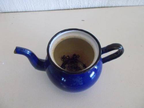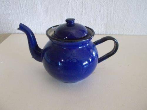 Vintage small blue enamel wear tea pot please see the wear inside as per pictures item will be good for display only please have a look at my other listings *free sprit*Thank you