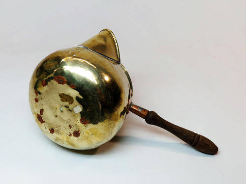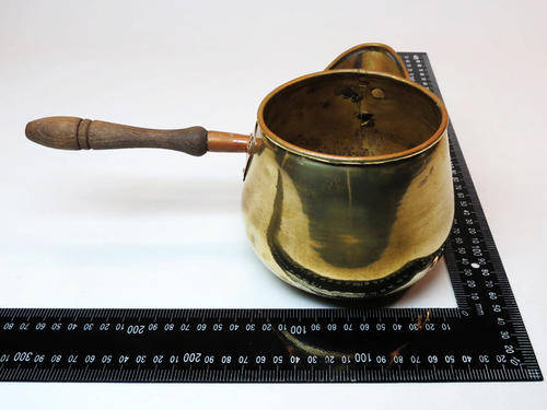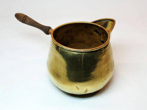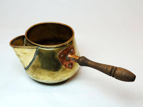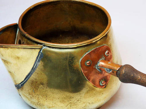 Small vintage brass and copper milk pot with wooden handle