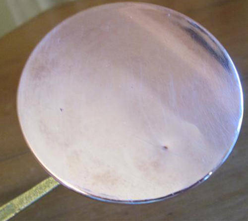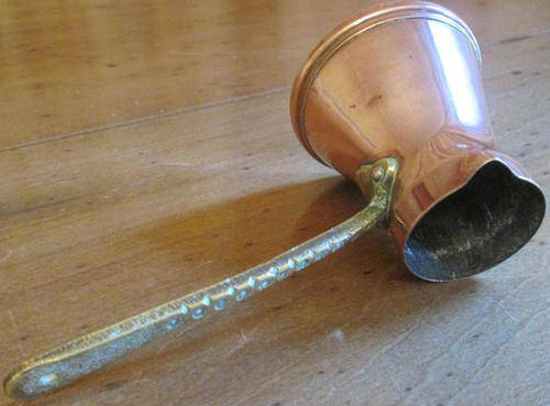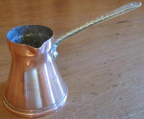 SMALL, COPPERED POT WITH A POURING SPOUT AND A BRASS HANDLE. THE CONDITION IS VERY GOOD WITH ONLY THREE PINPRICK "DINGS" TO THE BASE. HEIGHT 6.6cm, TOP DIA 3.8cm, BOTTOM DIA 6.6cm.