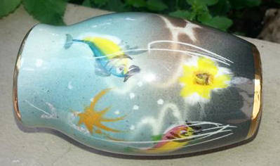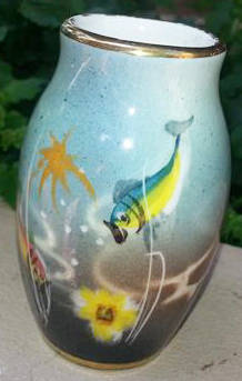 VINTAGE, HAND PAINTED SMALL VASE WITH FISH DESIGN, MADE IN ITALY, HEIGHT 8.5cm, NO DAMAGE.