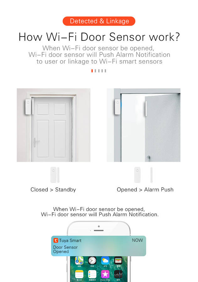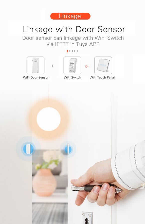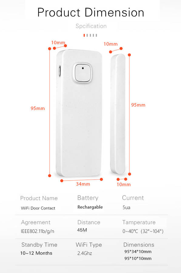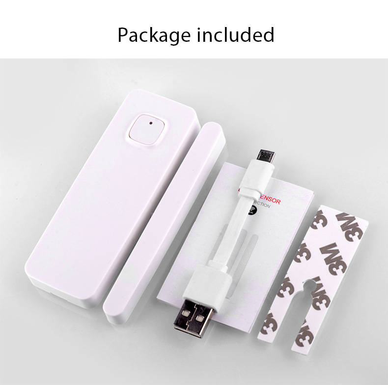 Features: 1. Door and window switch. Mobile App Remote Notification 2. Simple and convenient to use 3. Support intelligent voice control such as Amazon Alexa, Google Assistant, IFTTT, etc. 4. Display power, alarm management, alarm query 5. Query history 6. Mini portable size Specification: Product size: 70*20*16MM Color box size: 75*22*18MM Product net weight: 65g Product gross weight: 70g Packing lncludes: 1 * WiFi lithium battery door sensor 1 * Double-sided tape 1 * Manual