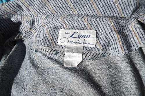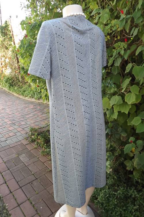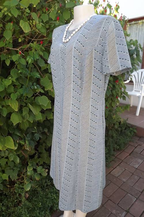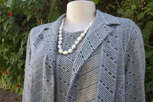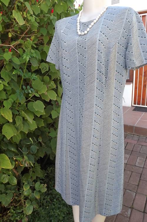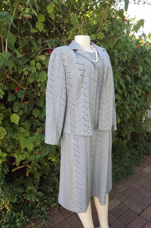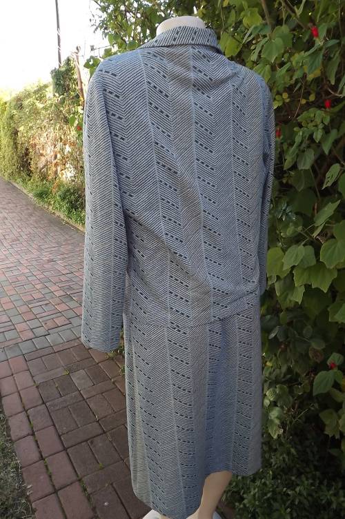 Smart 2 piece Vintage outfit in light grey with blue and turquoise lines.Size 42/18 by Miss Lynn by Mangattan Princess style loose dress with jacket in 100% polyester.Suitable for all seasons.Good condition