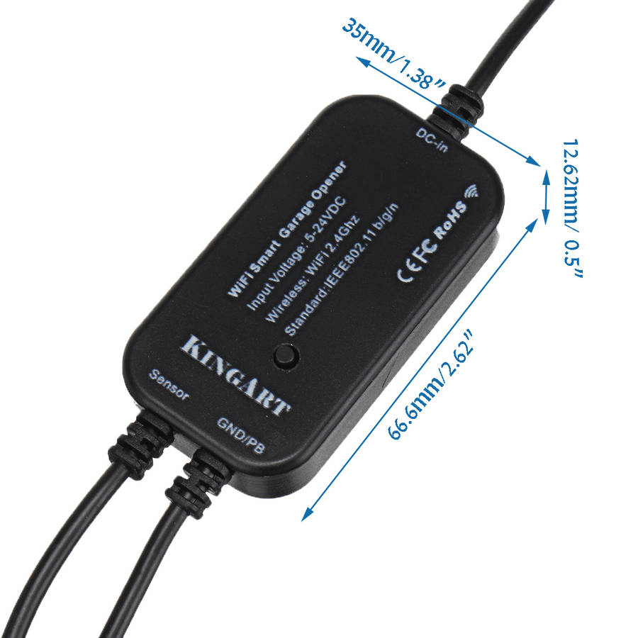 Material: ABS Color: Black Wide range Power supply: DC 5-24V Wireless standard: 802.11 b/g/n Security mechanism: WPA-PSK/WPA2-PSK WIFI remote control: turn on/off the door from anywhere App Support: Free iOS and Android Phone Apps Voice Control: with Amazon Alexa, Google Home Voice Control Timing function: Set the reservation/countdown timer to turn on/off at the specified time Size: (L) x (W) x (H) 66.6 x 35 x 12.62 mm / 2.62 x 1.38 x 0.5 in (appr.) Package included: