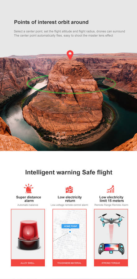 - Intelligent warning safe flight: Super distance alarm, low electricity return, low electricity limit 15 meters