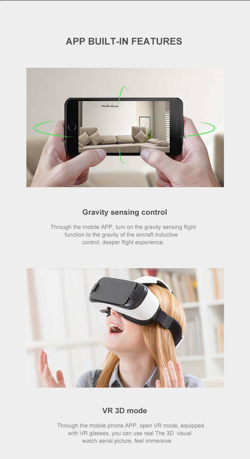 Voice control: Speak to the aircraft through the mobile APP. Give an instruction such as "rise", the aircraft will then rise as per voice instruction