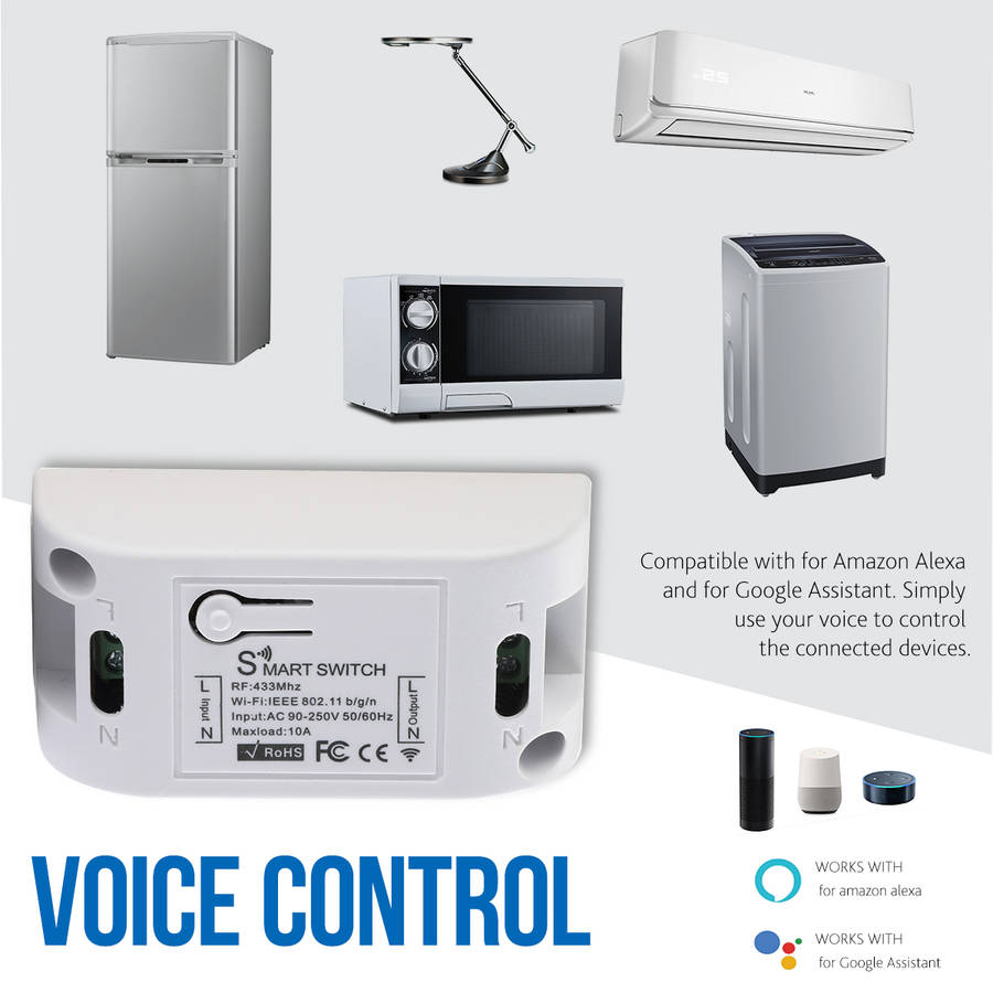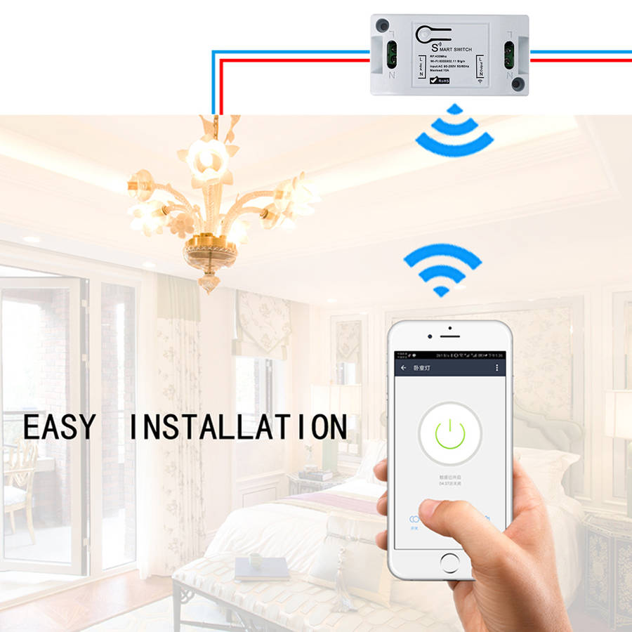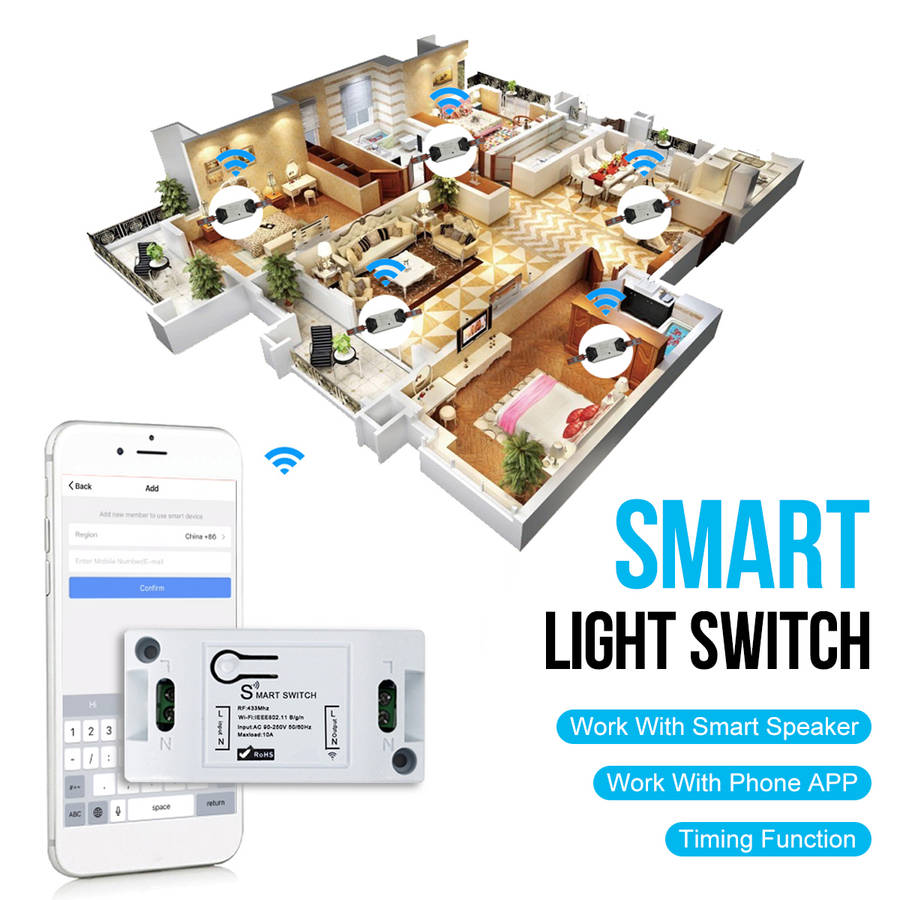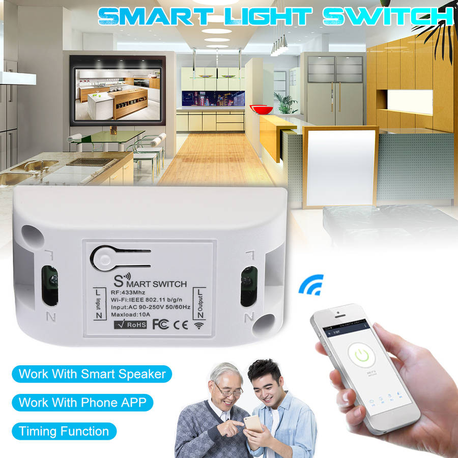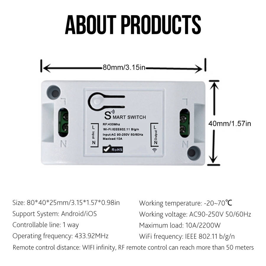 Main Features: 1.Voice control:once you have this switch,you can connect it with smart speaker for Amazon Alexa(for Amazon echo/dot/tap) or for Google Assistant to voice control. 2.Wi-Fi Remote Control:You can use APP in your smart phone to control the switch wirelessly with Wi-Fi or 4G network.no hub required. 3.Timing Function:Take full control of your home or office lights thanks to schedule timer that will allow you to plan the exact time to turn lights and appliances on/off automatically. 4.Share Device: This samrt switch can have several control sites shared by different family members.One mobile phone can control many switches also. 5.Add More Features: Let you do amazing thins with your light switch, turn lamps, fans or other electronics on before you get home or off when you leave. Specification: Product name: Wireless remote control switch Size: 80*40*25mm/3.15*1.57*0.98in Support System: Android/iOS Controllable line: 1 way Operating frequency: 433.92MHz Working temperature: -20-70 a Working voltage: AC90-250V 50/60Hz Maximum load: 10A/2200W WiFi frequency: IEEE 802.11 b/g/n Remote control distance: WIFI infinity, RF remote control can reach more than 50 meters Package Include: 1 * Wireless Remote Control Switch 1 * User Manual More Details:
