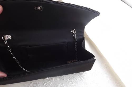 Smart little black satin evening bag pleated front.Can use as cluts or swing bag.