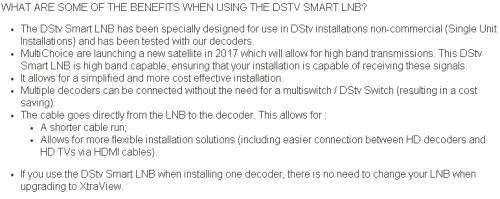 About the DStv Smart LNBThe recommended installation for the DStv Explora (when installed on its own) is a DStv Smart LNB.