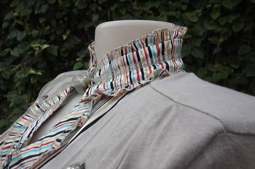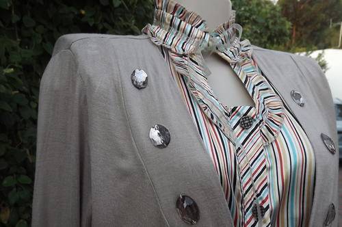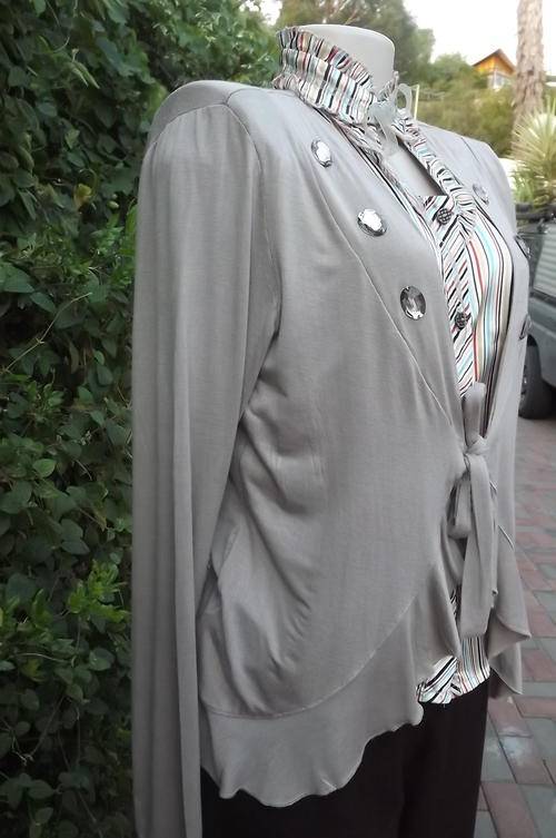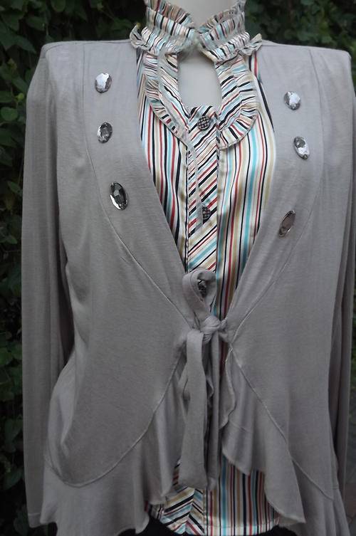 Smart long sleeve beige top with rounded front, in size 38/14 by Fengo. Satin look front with stripe inlays. High neckline with embellished open front In good condition.