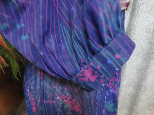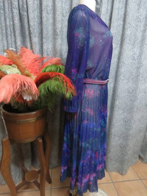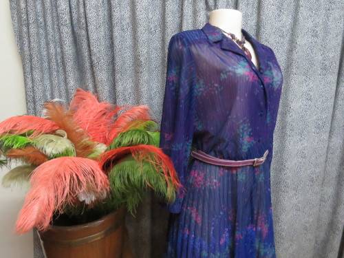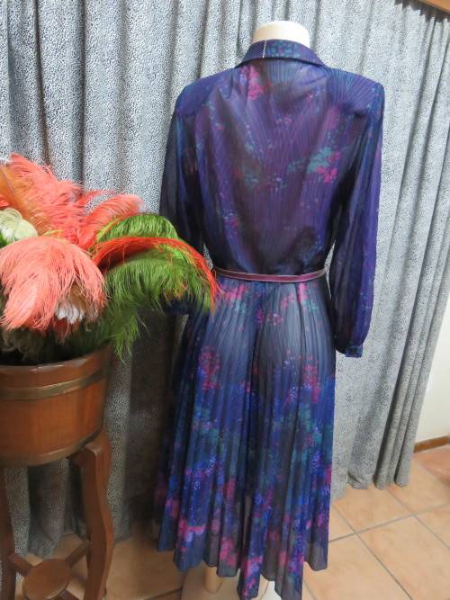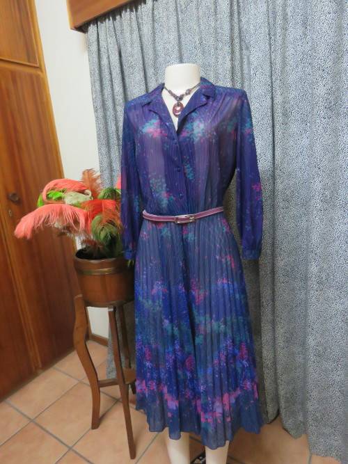 Smart navy vintage dress with permanent pleated bottom with pink and blue floral border.Size 40/16.Top with button down front.Gathering on shoulders.Long cuffed sleeves.Used but in good condition.