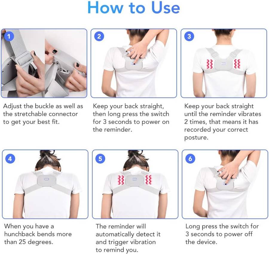 ADJUSTABLE & EASY TO PUT ON: Made from lightweight and breathable compound fabric, our back brace posture corrector providing all-day comfort. Our unisex posture brace with adjustable straps has been designed to be easy to put on. By using straps, you can easy to adjust the tightness of the back support brace as you wish without help. After wearing the posture trainer, straight your back and lift your chest, press the switch for 3 seconds to power on, the posture corrector will vibrate 2 times and rec