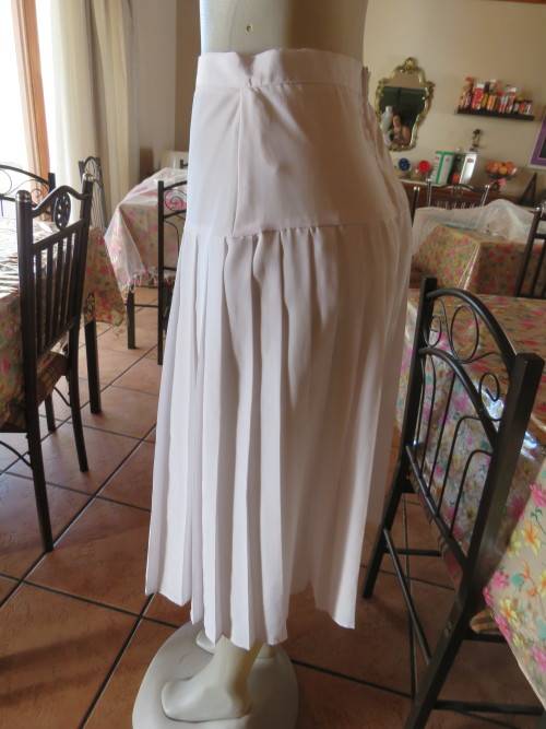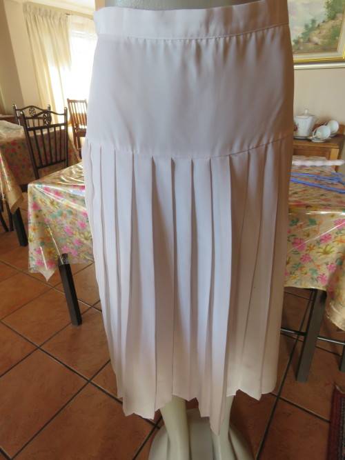 Smart white vintage size 35/11 skirt by 'SHELLEY PETITE'.In 100% wash and wear polyester fabric.Yoked top with permanent knife pleats.Zip at back.Good condition.