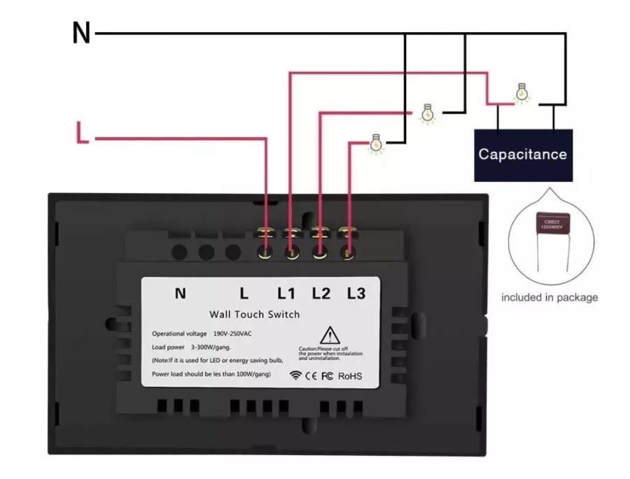 The supplied Capacitor is installed between the "Live" and "Neutral" Wire going to your lights near the 220v light fittings or near downlights transformer if 220v to 12v transformer for downlights installed or easiest accessible location possible. No Neutral Wire is required where the Smart Light Switch is installed on the wall.