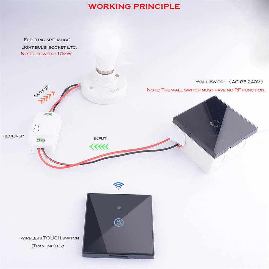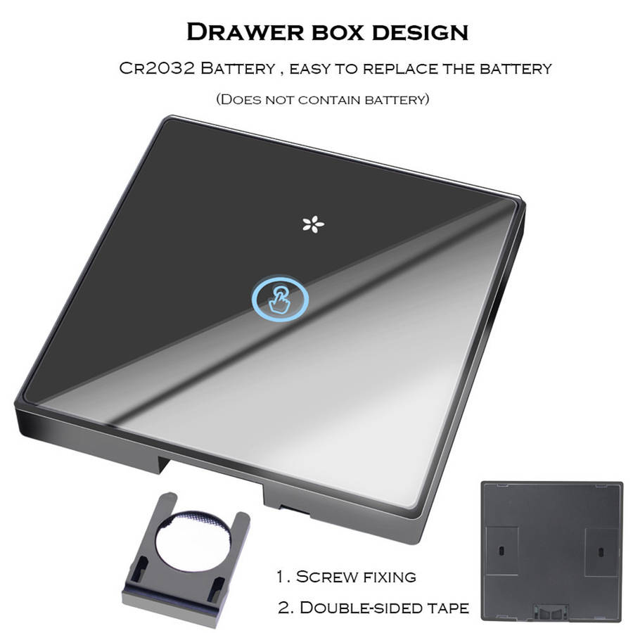 Wireless switch specification: 1, working voltage: DC 3V 2, working frequency: 433.92MHZ 3. Transmitting power: <10mW 4. Remote control distance: <50 meters (indoor distance) 5, working method: wireless remote control 6, coding method: learning code 7, modulation method: ASK 8, working temperature: -10 deg C ~ +70 deg C 9, size: 86 * 86 *15 (mm)