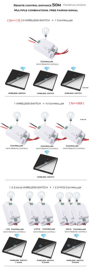 Clear the signal Press and hold the controller for 10 seconds to clear the code (the code indicator flashes 10 times); NOTE: 1.One controller can be equipped with 15 switches, one switch can be equipped with many controllers 2. Do not operate with power. Turn off the power supply and operate it. If the test is confirmed to be correct, use it under the guidance of a professional electrician. 3. When the voltage of the remote control is insufficient, please change the battery in time (the remote control distance becomes closer when the remote control battery voltage is insufficient). 4. When using wireless electronic products, care should be taken to avoid metal masks, large electronic devices, electromagnetic fields, etc., which have strong interference sources, to avoid remote control and short receiving distance or to work normally. 5. Do not use this electronic product abnormally. Abnormal use will reduce product performance and longevity. In severe cases, damage to the product will also pose a safety hazard.