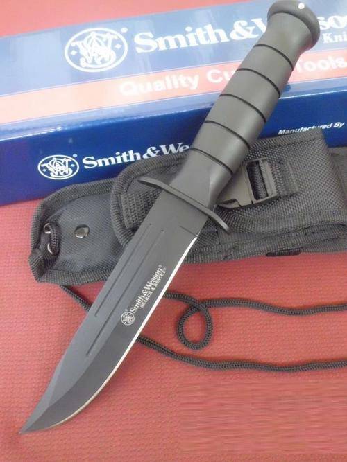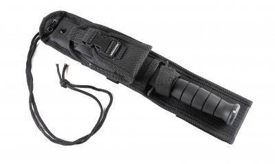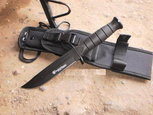 The Smith & Wesson Search & Rescue Marine has a black powder coated 440C stainless recurve style blade with "Search & Rescue" and Smith & Wesson logo etching. The handle is grooved black rubberized aluminium. It also has a black finish guard and pommel. A heavy black Cordura belt sheath with hard shell liner is included with this knife.