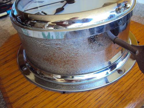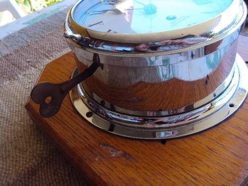 The clock runs well and has the original key. 8 day movement The chrome work is in good condition with the exception of an area on the top. The damage to the chrome is only on the centre band and would be worth while re chroming. probably needs a service.