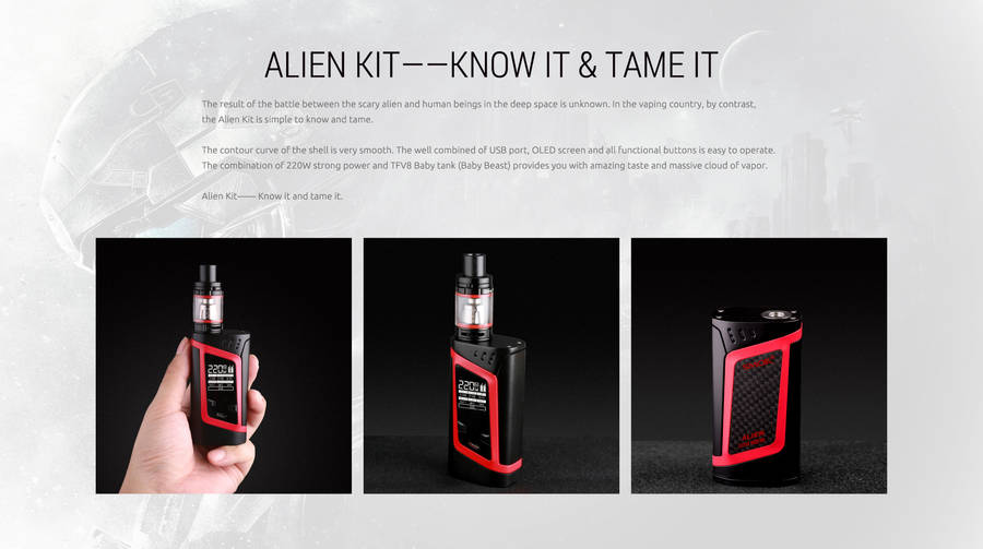The first of it's kind from Smok, the Alien 220W is a unique and out of this world high wattage device. Equipped with a large OLED display on the front face, information is now more detailed and easier to see that ever before. The design and button placement allow for an ergonomic feeling better than ever before. The lateral fire button combined with the button placement allows for easy operation for the most efficient vaping with no hassle. The Alien 220W accepts two 18650 batteries (batteries sold separately), which is installed through the bottom battery panel for the utmost convenience. Edgy carbon fiber inlays accent the unit to give it that aggressive feel while also making sense to finish off with a powerful, functional, and aesthetically pleasing device.