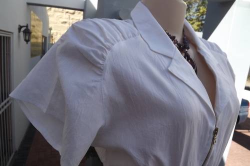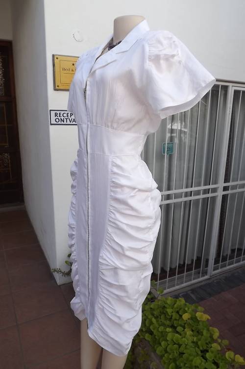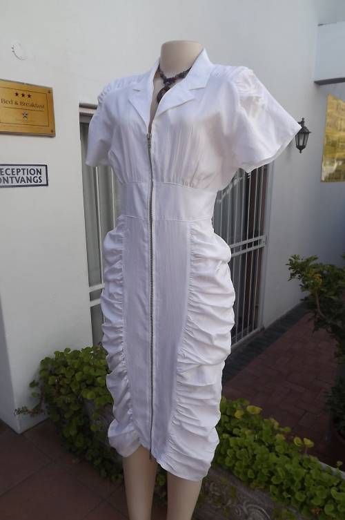 Snow white creased polyester zipped up dress.Size 37/13.Ruched inlay on front and back.Stunning fit with band around waist.Unique gathered sleeves.New condition.