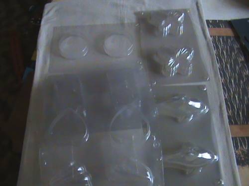16 assorted plastic soap moulds , there are 2 shapes per mould 3 dolphins, 3 butterflies, 2 hearts, 2 fish, 1 round, 1 shell, 1 handmade soap rectangle and 3 plain rectangles so altogether 32 moulds but 2 per set see photo R50 for all
