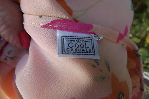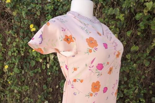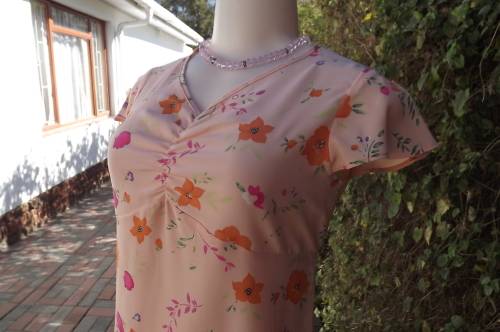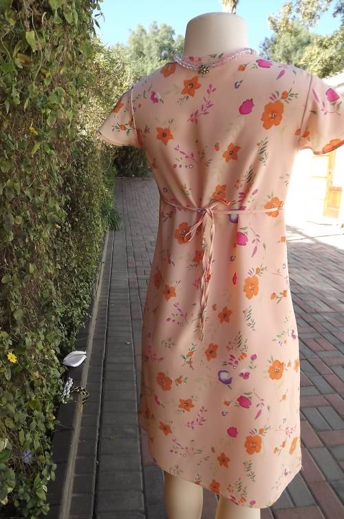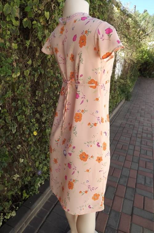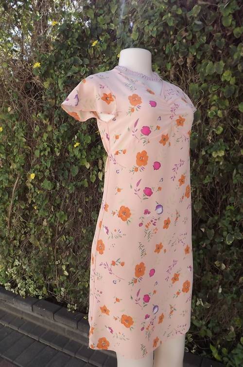 Soft apricot colour shift dress with empire waistline.Gathering in middle neckline.Size 30/6 by COOL CASUALS.Cheerful floral pattern.Flare capped sleeves.Thin straps at side to tie at back.As new