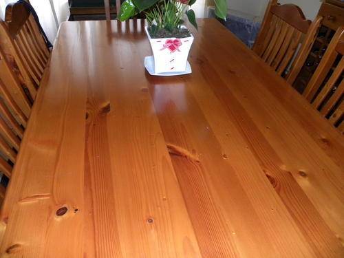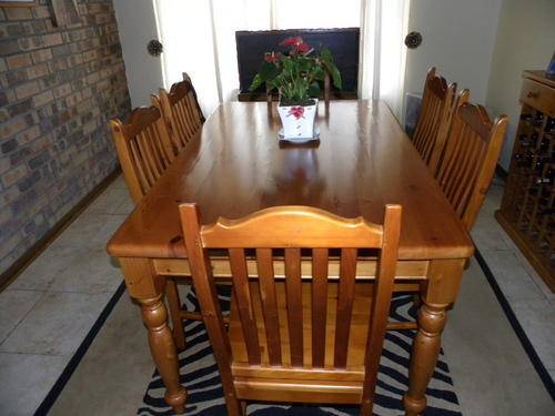 Solid Oregon Pine dining rom suite - 6 seater. The table and chairs are in good condition, please see pics below - dimensions - table is approximately 1,8m long and 1,2 m wide.
