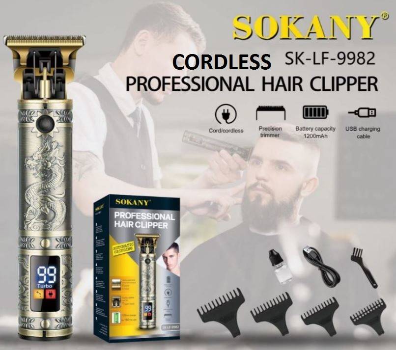 Sokany Professional Cordless Hair Clipper- LED Display , Ergonomic Design, Gold Plated Carbon Steel T Shaped Blade Head, Automatic Grinding , Includes 4 Piece Detachable Guide Combs , Cleaning Brush , Lubricating Oil , Rechargeable 1200mAh Lithium Battery And USB Battery Charger, Colour Gold Retail Box 1 year warranty