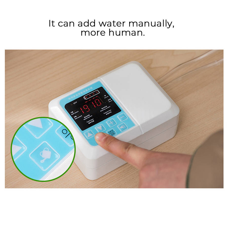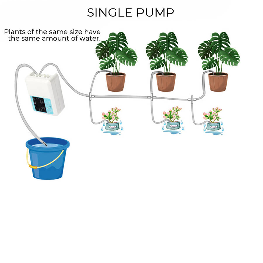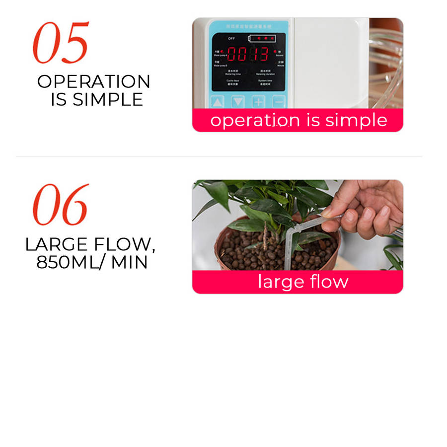 Specification: Name : Intelligent Watering System Type:?Single water pump+ 10??Drops of arrow /?Double water pump+15??Drops of arrow (optional) Battery Voltage : 3.7V Input Voltage : 4.2V-4.6V Pump Flow : 850ML/min Motor Power : 3W Battery Capacity : 1200 mAh Interface Type : MicroUSB Waterproof Rating : Rainproof Charging method: solar charging, USB interface charging Battery type: 18650 lithium ion battery Feature: -Auto Watering: Setting the watering and interval time as the plants needed, then the system will automated watering the pots on time. -Water-Saving Design: Use less water than traditional spray & drip heads, by spot watering only exactly where needed. -Detect & Protect: When it is low power and lock water, the indicator light will be red or start a sound to remind you. -New timing system : Timed watering and watering time can be easily controlled, watering in manual mode, water can be added manually by tapping the button, independent of automatic mode. -High flow and large lift: Lift 5 meters, water flow 850ml / minute, solve the problem of insufficient water pressure in high plants. -Built-in water pump, can pump water from the container to avoid the risk of water leakage. -Built-in overcharge protection lithium battery, phone charger.Solar charging board can be charged or long-term power supply. -Double pump can be independently timed, different plants have different watering amount and watering frequency.The single pump water quantity is the same. -No need to connect the faucet. Water containers can be chosen freely and used more conveniently.(Purchase does not include) ?Package included: ?1??Single water pump+ 10??Drops of arrow or ?1??Double water pump+15??Drops of arrow (optional)